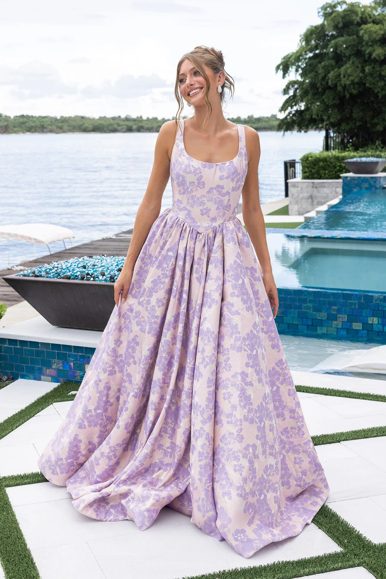 XO185 features a structured square neckline with wide straps and a fitted bodice that transitions into a full A-line skirt. The gown?? elegant jacquard fabric adds dimension and texture, giving it a refined, classic appeal. A thigh-high slit adds a modern touch, while the open back completes the look with understated sophistication.